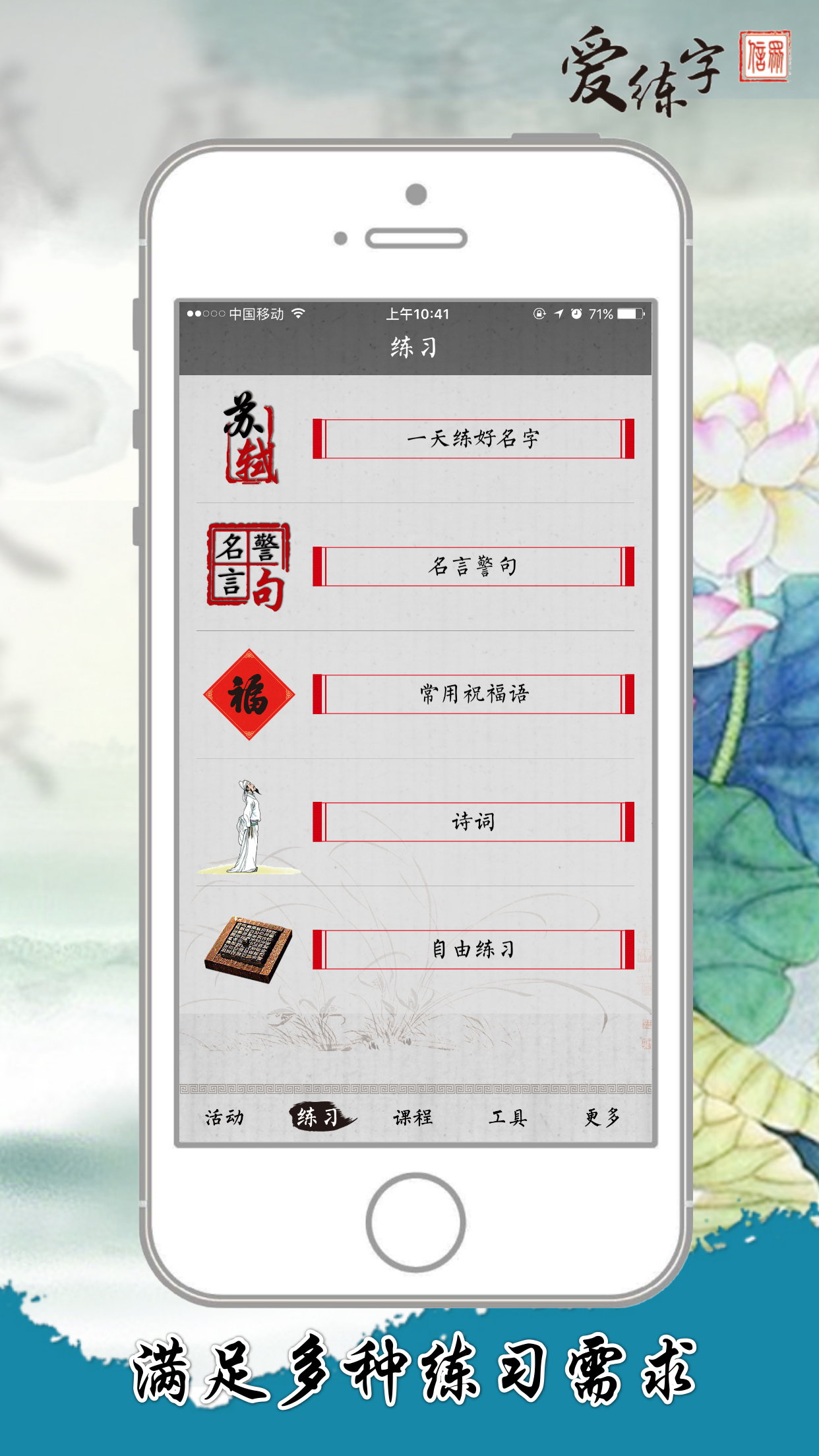 爱练字APP,一个针对书法爱好者量身定制的练字软件,适用于学生自学,成人社交,集教学、练习和交流互动为一体。【功能特色】