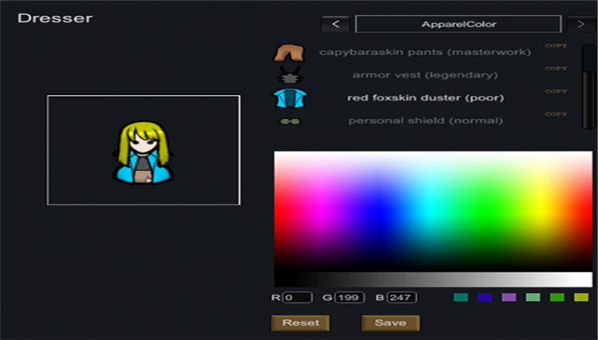 Adds a dresser and mirror which allow a pawn to change their apparal colors, hair color, skin color, hair style, body type, head type, and gender.增加了一个梳妆台和镜子,让一个棋子来改变他们的家俱颜色、头发颜色、皮肤颜色、发型、体型、头型、和性别。