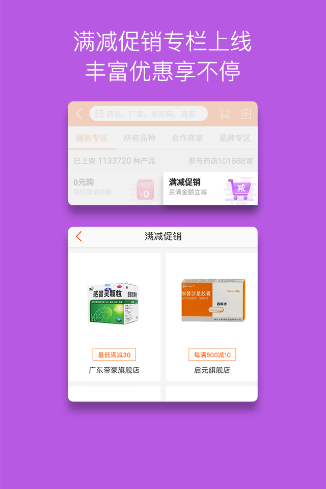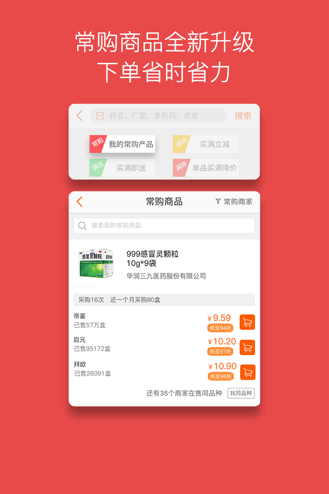 商家众多,药品齐全,专人对接,服务到位;操作简单,配送及时,沟通顺畅,对账轻松;多场促销,多重钜惠,畅享折上折。