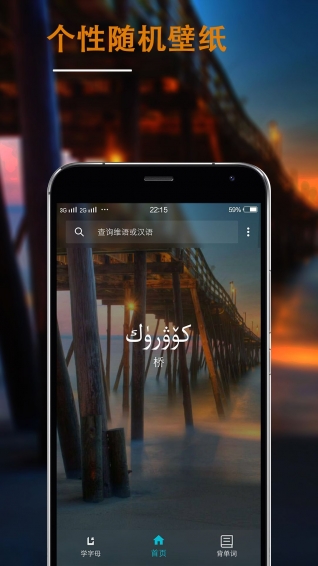 # 精致高效每次打开应用,是不一样的背景,对应一个维语单词和它的汉译,让用户能够通过打开应用就很自然地学习。
