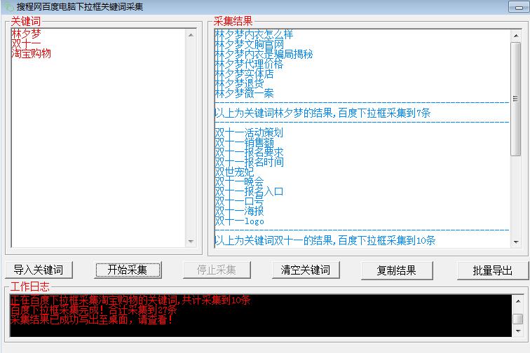 分享一下这个百度电脑下拉批量采集工具,对于有大量的下拉词要做的客户非常的适合,比如微商的,医疗的,美容的等等,一下子做了100个关键词,要查询这100个关键词出了几个下拉,总不可能一个个的去百度查询,就可以用本工具进行批量查询。如可建立1.txt的记事本,在记事本里复制所有要查询的下拉主词,一行一个,然后点击导入关键词,就会在左边显示,然后下边点击开始采集,右边就会出现得到的下拉搜索结果,这些结果可以自己复制,也可以自己批量导出,比较方便。这程序是由易语言编写的,比较通俗易懂,