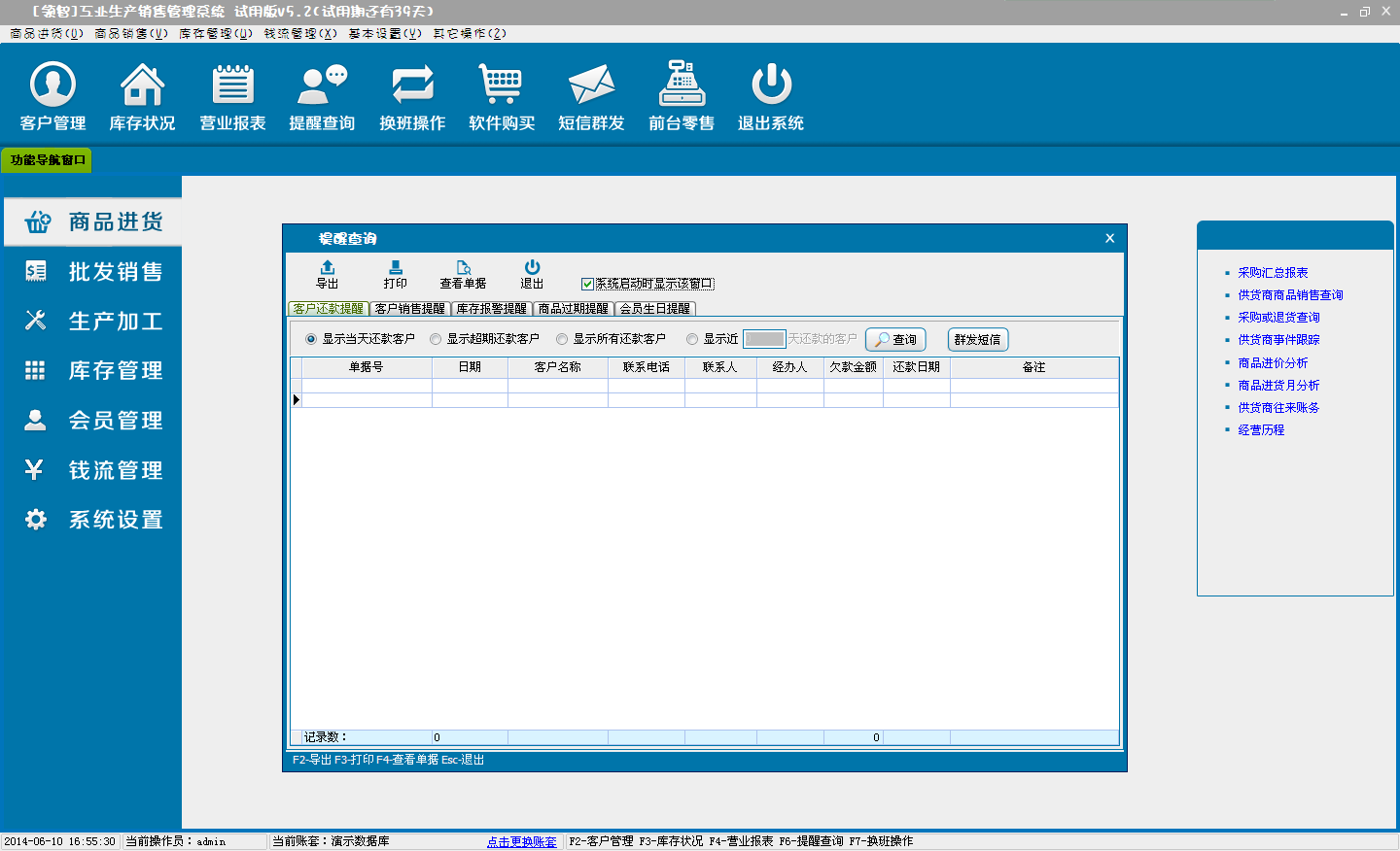 4、提醒查询:客户还款提醒、客户销售提醒、库存报警提醒、商品过期提醒、会员生日提醒