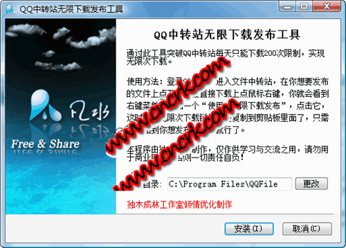 QQ中转站无限下载发布工具 V1.0 简体中文优化安装版 使用说明:先安装凡水QQ无限下载发布工具,登录QQ邮箱,进入文件中转站,在你想要发布的文件上点下载,在直接下载上点鼠标右键,你就会看到右键菜单上多出一个“使用QQ无限下载发布”的选项,点击它,这时候,无限次下载链接已经复制到剪贴板里面了,只需要粘贴到你想发布的地方就行了。