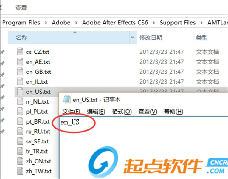 4、相反如果我们要切换到英文,我们要在Adobe After Effects CC/Support Files/AMTLanguages路径下,新建 en_US.txt 的文本文档(文本内容是:en_US)。