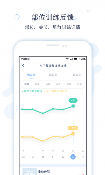 2、依据脉吉康复设备,实时监控运动数据,通过专业的算法转化为可视化数据反馈给康复师,让康复师每天能知道您的训练状况及每个关节的角度变化,并实时调整您的康复方案。