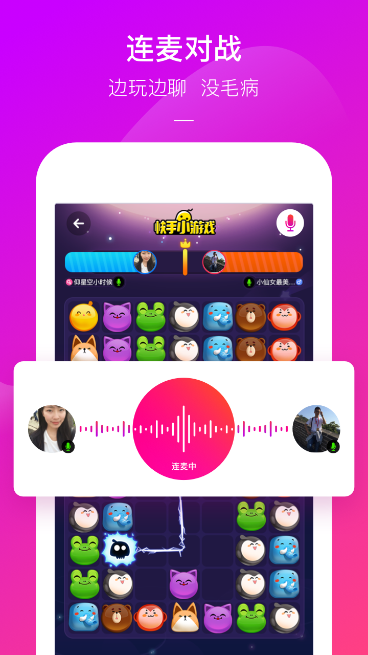 真人实时匹配对战,连麦游戏,边玩边聊,快来一起PK! 连连看、五子棋、斗兽棋、消砖块......每周更新,玩法不断玩游戏、交朋友,尽在快手小游戏!【软件特点】