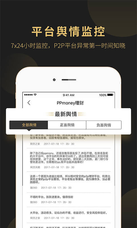 ※个人资产分析:您的专属理财顾问,帮您分析资产健康状况并提供专业的投资组合建议;※平台舆情监控:7*24小时监控,P2P平台异常及时时间知晓;