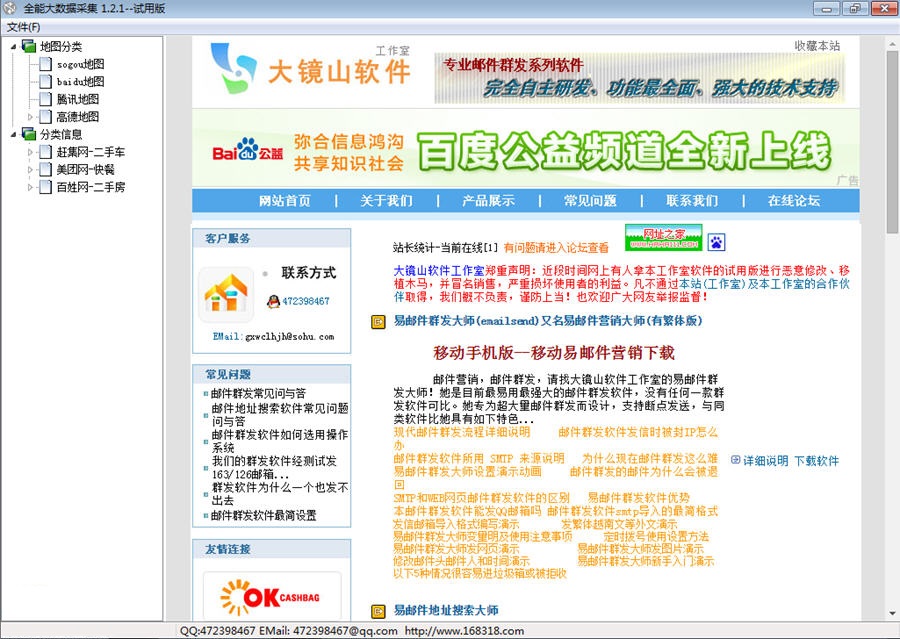 大镜山全能大数据采集是一款专业好用的大数据采集软件。该软件拥有地图分类、分类信息等两大模块,可快速针对用户所输入的关键词进行信息采集,一键采集相应的数据内容。