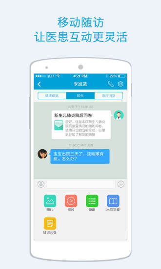 -----患者随访:作为蓝牛云随访系统的手机端延伸,蓝牛医护实现与蓝牛云随访系统下PC端和移动端双端配合,发送给患者随访问卷以及出院宣教内容,让患者享受更多和其个人情况相关的医疗知识,实现更为灵活的随访互动。