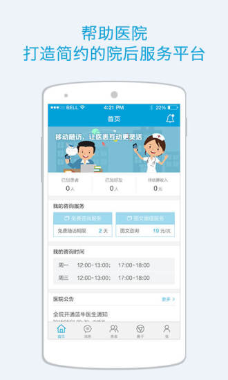 -----咨询服务:提供对熟人患者的咨询服务、图文增值服务,可根据医护自己的空余时间设置咨询时间,可主动添加患者、好友,以实现咨询服务的扩展。-----消息互动:以文字、图片、视频、短语、患者转介、患者病历、随访异常处理提醒等多种方式,便捷的实现与患者之间的消息互动、与同行之间的病例讨论,从而实现院后患者服务的连贯性和可信性。