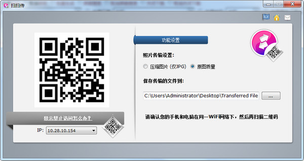 这款工具的最大特点就是方便,它不需要您在手机上安装任何App,只需在电脑上安装扫扫传程序就可以了。 您只需要用您的iOS相机或者微信/QQ等能扫二维码的App扫一扫程序界面显示的二维码,就可以立刻开始传输文件到电脑了。 扫扫传支持批量传输,可以让您一次性传输上百个文件,并且因为优化了网络连接,传输速度非常快,几秒钟就可以传输非常多的照片。【软件特点】