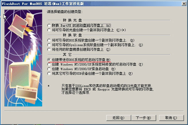 选择您要通过哪媒体创建U盘启动,由于我们制作的是DOS启动,所以我们选择“创建带迷你DOS系统的可启动闪存盘。