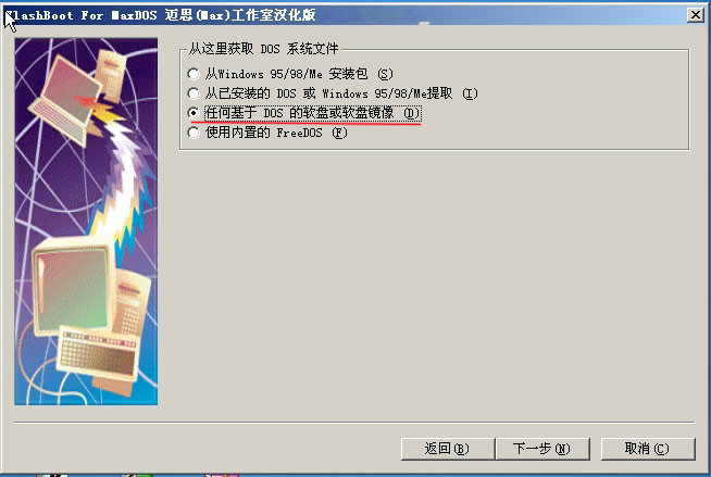请选择您的启动文件来源,如果没有,可以选择“任何基于DOS的软盘或软盘镜像”