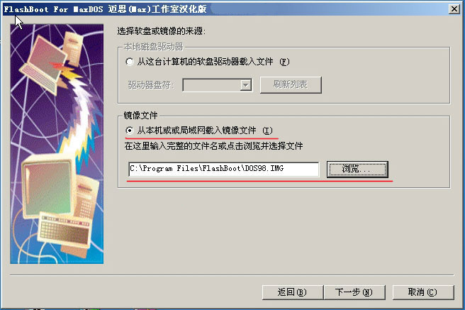 然后在下图中选择你的DOS启动盘的软盘镜像,如果您没有,可以选择FLASHBOOT安装目录中的由我们集成的DOS98.IMG镜像,此镜像已包含MSDOS 7.1的启动文件。