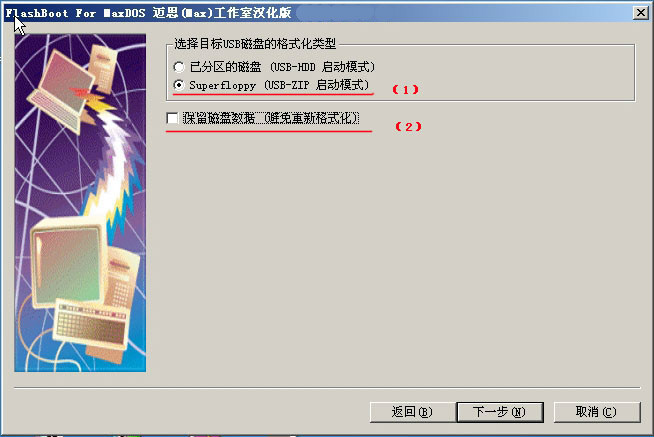 在这一步选择U盘的启动模式,大家的都USB-ZIP的启动模式相对来说兼容性,及稳定性都相对要好,而且启动后就直接是A盘符,这样大大的方便了我们制作DOS启动。所以这里我们建议您选择USB-ZIP模式,如果您要保留U盘的资料请先选中启动模式如:USB-ZIP,然后再选择“保留磁盘数据”这样可以不格式化U盘而直接制作引导了。