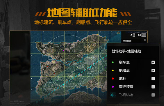1、地图辅助行中飞行轨迹标注,可选择高级装备降落点降落,快速获得枪支武器,赢在起跑