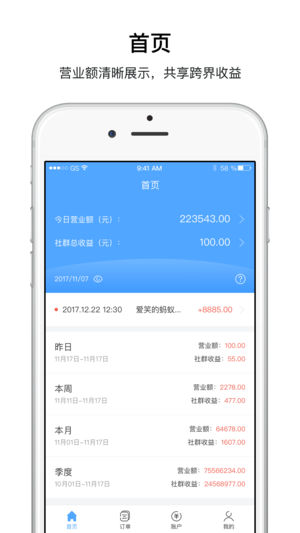 1营业额与社群收益管理。2订单查询。