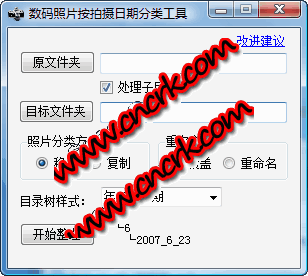 数码照片按拍摄日期分类工具 V2.0 简体中文绿色免费版 目前的各种相册软件、数码相机附赠的软件除了佳能的ZoomBrowser Ex很少有支持按照片的拍摄日期批量管理的。PhotoTool就是为了解决这一问题而诞生的:一个小巧简单的工具,用来把文件夹中的照片按拍摄日期批量整理到不同的文件夹中去, 是数码相机的必备小工具。