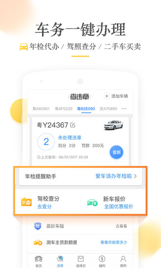 违章查询,爱车服务管家,专注为车主提供一站式违章查询、加油充值、二手车买卖、底价车险、周边服务、车品优惠购、汽车热门资讯等汽车服务。【软件特点】