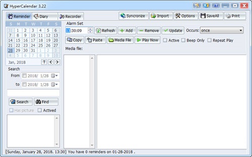 HyperCalendar是款很有意思的日历。它的有趣之处是他可以播放一些多媒体文件,包括常见的MP3、MP4还有一些音频文件,软件小巧、实用、非常适合一些办公人士。HyperCalendar 是一款强大的个人信息管理软件,集成了一个透明的桌面日立,一个多媒体提醒器和一个模拟闹钟和一个可加密的文本日记本,最后还有一个录音机。提醒器可以播放绝大多数格式的媒体,如:mp3, wmv, avi, asf, mpeg, flash等等,可以以关键词方式搜索日记本和提醒器。