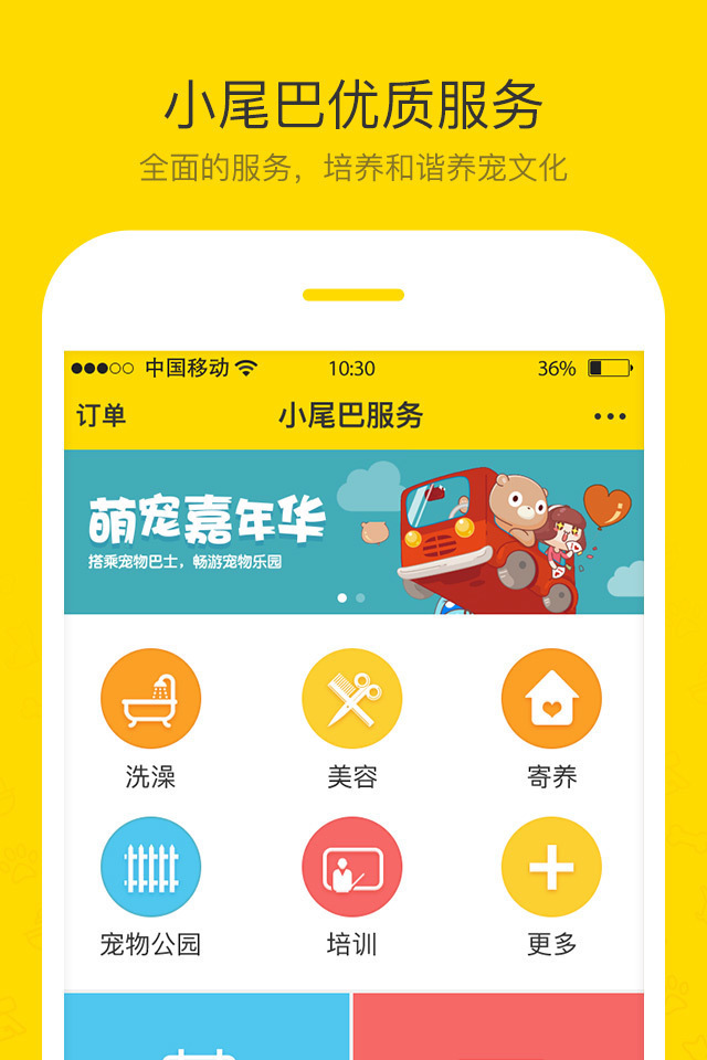 -小尾巴宠秀:分享宠物的美图,传递快乐能量,赶快来点赞吧;-服务预约:给爱宠最舒适高端最细致的服务;美容,洗澡,寄养,健康管理;
