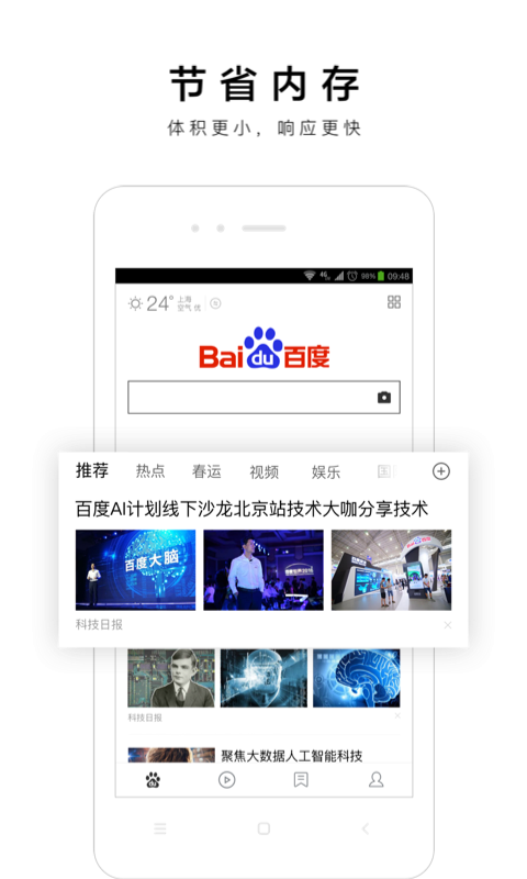 百度极速版,短小精悍的搜索应用。给你更简洁、更流畅的搜索体验。百度极速版,流畅体验,不卡顿。