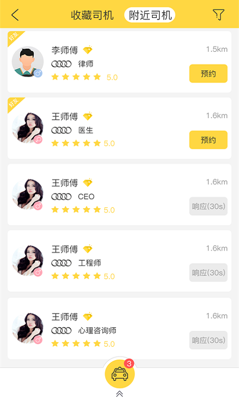 无需预约,快速叫车,平台自动派单,司机分秒接驾。您还可以通过【附近】功能,选择不同车型,不同年龄、职业的司机,实现实时叫车或预约叫车,不再是强迫式派车,让您享受一段愉悦的出行体验。