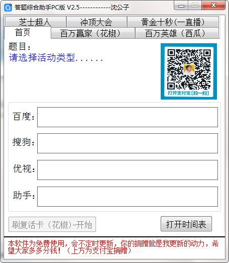 下载答题综合助手pc版,选择你需要的参与直播点击题目,就能得到答案,还能点击【时间表】,了解答题时间