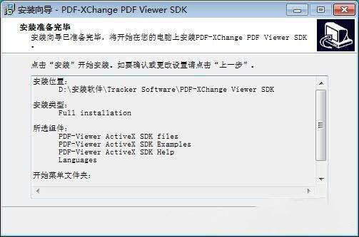安装向导默认将软件安装在C:\Program Files\Tracker Software\PDF-XChange Viewer SDK文件夹路径中。安装软件至少需要1.2MB的磁盘空间;