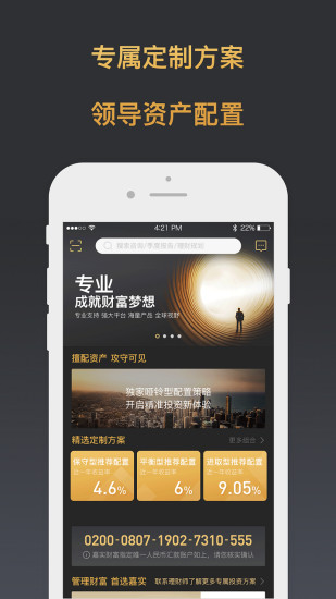 理财街是嘉实财富管理有限公司的私人财富管理平台。平台汇集了专业的理财工作室和私人理财师,提供多种资产配置模型和海量投资产品,致力于为高净值用户提供专业的财富管理方案。【软件功能】