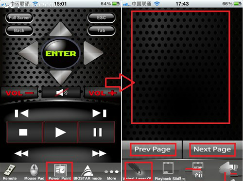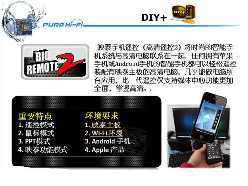 BIO Remote2手机遥控支持所有使用映泰主板的pc机,需要在windows 7/vista/xp系统下安装服务器端软件,再在android手机上安装遥控软件。软件通过wifi网络与pc实现连接,提供虚拟触控板功能,可代替鼠标进行各种操作。 BIO Remote2专门的powerpoint工具可操作幻灯片播放。另外,bio remote 2还可专门对应多款媒体应用软件实现虚拟按键遥控,包括windows媒体中心、windows media player、powerdvd、winamp,以及国人常见的ppstream、暴风影音等。