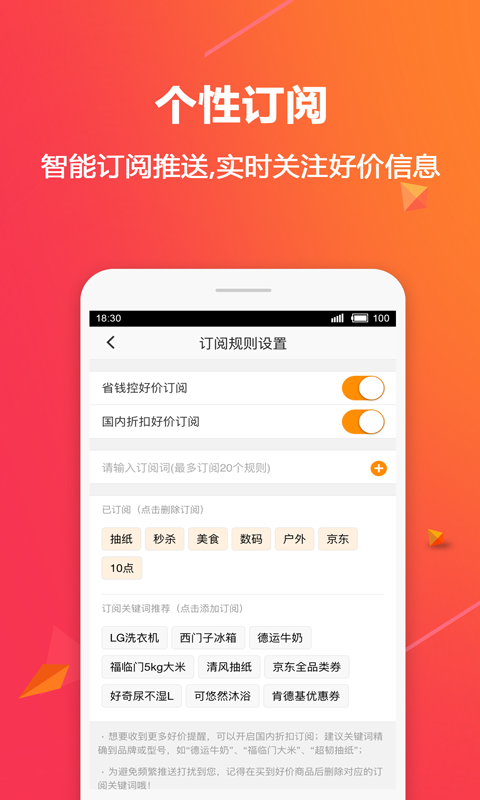 智能订阅关键词推送,从上千条折扣中为您推送感兴趣的优惠商品,轻松实现全网特卖监控,不再错过商品打折信息。