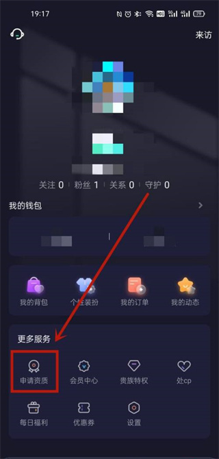 2、接下来,在“我的”页面,提供了申请资质、会员中心、贵族特权、处cp等服务选项,此时我们点击【申请资质】这项服务。