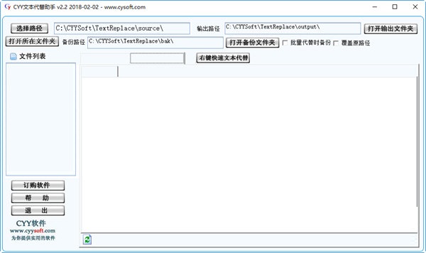 CYY文件代替助手是一款绿色小巧的文本替换软件。可以批量修改整个路径的文件内容或者文本内容,还可一键恢复原来的文件或文件夹,支持批量替代备份和覆盖原路径。需要的快来下载吧!【软件特点】