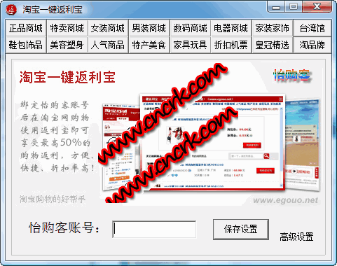 淘宝一键返利宝 V1.0 简体中文绿色免费版 淘宝一键返利宝是怡购客专门为淘宝网广大买家设计的一款小巧易用的淘宝购物返利软件,用户只需将软件下载到自己的电脑上并捆绑上怡购客的账户即可享受在淘宝网购物最高达50%的购物返利!该软件是一款免安装,纯绿色的浏览器插件,暂只适用于以IE为内核的浏览器中。
