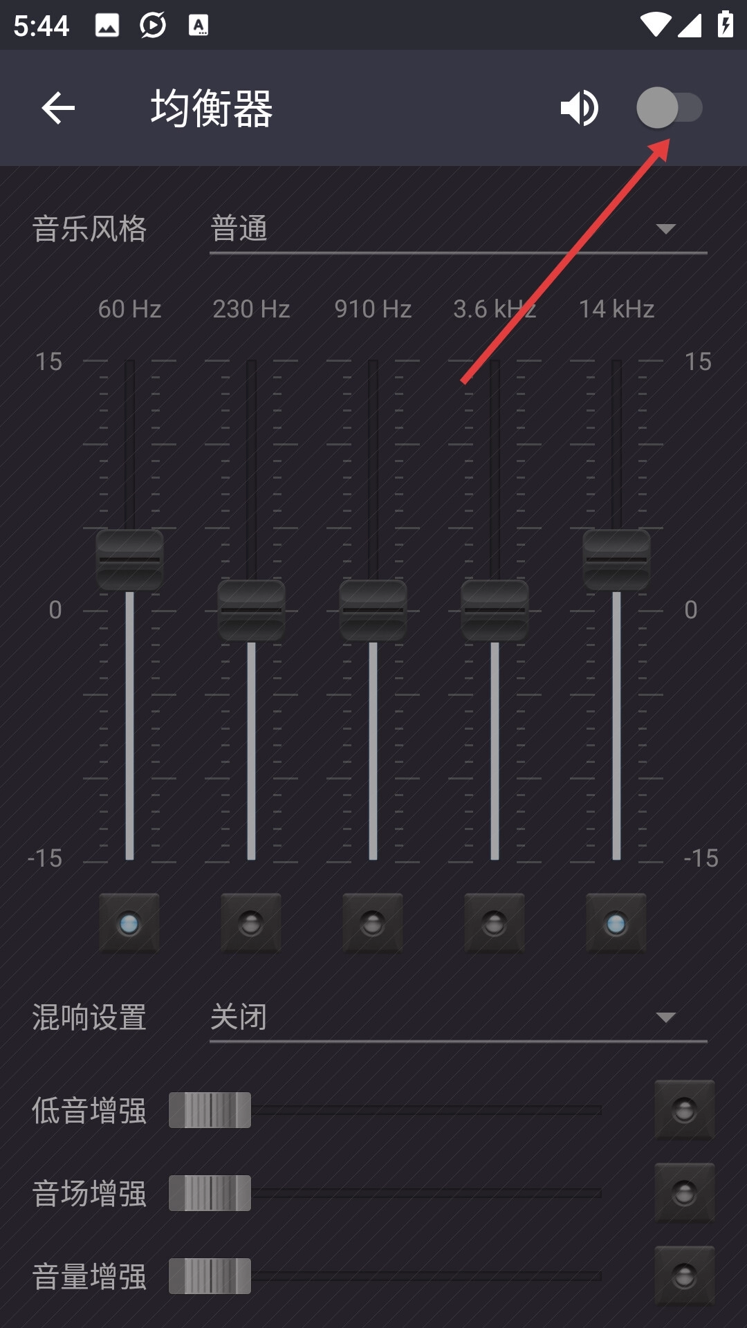 3、来到均衡器界面后,默认为关闭状态,并且界面显示为灰色不可进行,需要我们点击右上角启用。