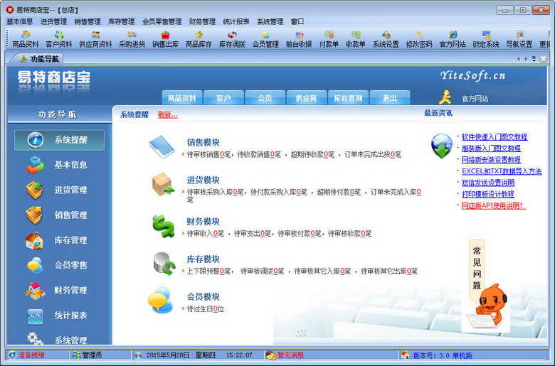 基本设置:商品分类建立,商品信息,客户信息,供应商信息的建立,打印模板设计等。业务管理:采购进货管理,销售出库管理,采购进货报表,销售出库报表等。
