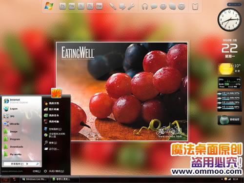 魔法桌面原创xp仿windows7桌面主题——春季水果美人。本主题包含三种字体版本,默认是宋体版,您可以在“外观”-“字体大小”处切换至微软雅黑版或是arial字体版。此主题还附带精美的春季水果美人仿windows7登陆界面哦