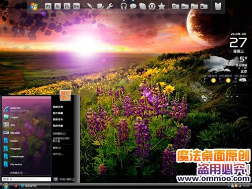 魔法桌面原创xp仿vista桌面主题——绚丽海平线,在这款主题中漂亮的开始菜单和标题栏特别抢眼,粉色到紫色的过渡突出了绚丽的效果。为了获得更好的显示效果,特别在开始菜单中“隐藏”了“注销”按钮,整体简洁又美观。为了获得最佳显示效果,请将桌面图标大小调整为32×32。本主题包含两种字体版本,默认是宋体版,您可以在“外观”-“字体大小”处切换至微软雅黑版。此主题还附带精美的仿vista登陆界面哦~