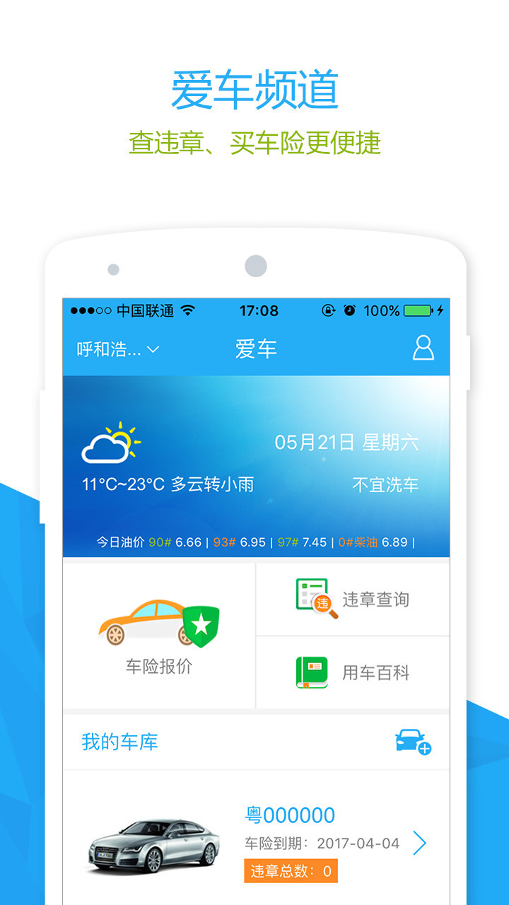 【买车险】与平安、人保和中华联合等多家公司合作,为您提供车险询价、多方案比价、在线支付、快速出单一条龙服务,买车险更快更便捷;【查违章】全国三百余地市违章查询,添加爱车新违章自动推送,关心您的爱车状况;