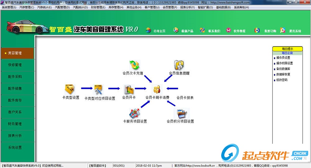 特色一:会员管理--功能强大,流程清晰(解决会员管理不规范的问题)会员业务是汽车美容店最主要的营销和留客方式,那么美容管理就是汽车美容管理软件最核心的功能了,一款汽车美容管理软件是否好用首先要看会员管理功能是否强大。智百盛汽车美容管理软件中的会员管理包含了:卡类型设置、会员开卡、服务项目设置、会员卡充值、会员信息提醒、会员卡报表、积分项目设置等功能,功能完善能够满足90%的店铺会员管理需求,同时所有的操作都有流程指向图,即使是新手都可以快速的进行业务操作。