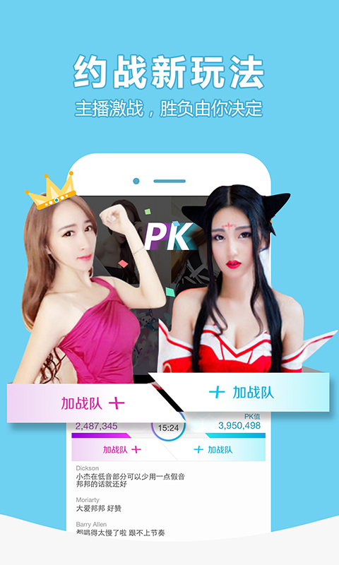 YY约战移动版,这里有美女PK秀场,游戏直播,才艺表演,更能随时随地聊天语音互动。YY约战,屌丝逆袭女神的聊天交友神器,数千万单身男女的不二之选!