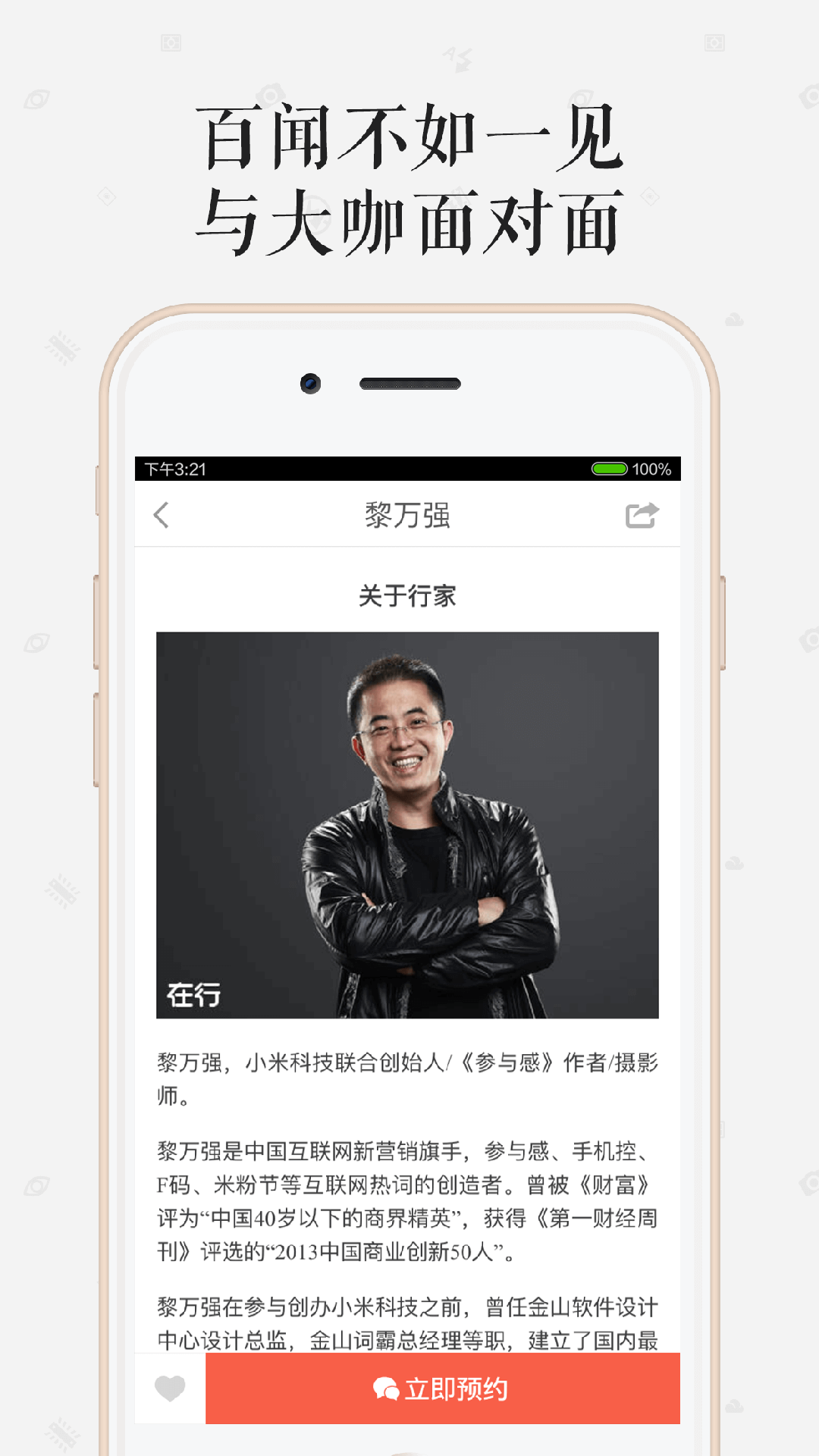 买东西上淘宝,找行家上在行。「在行」,风靡十大城市,超过8000名各领域行家里手,创投专家、职场大咖、心理咨询师、摄影师、企业领袖、知名学者、人气明星……,已经帮助数十万人改变他们的工作与生活。