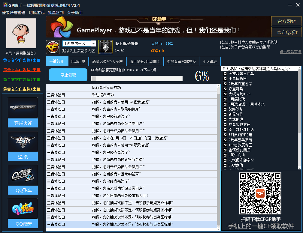 GP助手下载 v2.5 官方免费版 起点提供GP助手官方下载,GP助手是一款功能强大的热门游戏活动一键领取助手,GP助手支持穿越火线、逆战、QQ飞车、QQ炫舞等多款网络游戏,通过它您就可以一键领取所有的活动奖励,还可以一键签到、查询活动和封号,再也不用频繁的登陆和切换游戏了。
