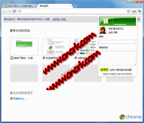 谷歌浏览器青檬音乐台插件 V1.0.6 简体中文官方安装版 你可以在忙着一边绘图设计一边听着青檬音乐台;可以一边写着公司项目计划书一边听 …青檬音乐台是24小时播送流行歌曲的网络电台,并提供最新歌曲排行榜,mtv,明星访谈。青檬音乐台chrome扩展让你不需要打开网站就可以收听青檬!