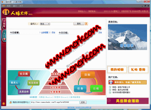 人脉大师软件 V3.3 简体中文绿色免费版 “人脉大师”是一款简约、实用、高成效的人际关系经营+个人成长管理的个人软件,由中华风云际会俱乐部鼎力策划与投资研发。适合于人们用来管理自己的社交圈和人脉关系,社交活动及合作关系,还可以自动群发个性化手机短信,自动批量导入名片等等,在节日或朋友重要纪念日来临前还会自动提醒。