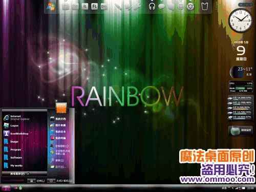 彩虹电脑桌面主题 简体中文官方安装版 魔法桌面原创xp仿vista桌面主题——彩虹。本主题包含三种字体版本,默认是宋体版,您可以在“外观”-“字体大小”处切换至微软雅黑版或是arial字体版。此主题还附带精美的仿vista登陆界面哦