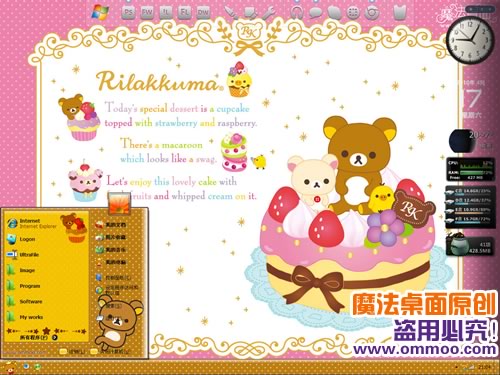 魔法桌面原创xp仿windows7桌面主题——轻松小熊。带有淡淡白色点点的开始菜单让我们的这款主题显得十分的可爱,另外,主题的开始按钮上同样也有我们可爱的主角哦!本主题包含三种字体版本,默认是宋体版,您可以在“外观”-“字体大小”处切换至其他字体版本。此主题还附带精美的仿windows7登陆界面哦