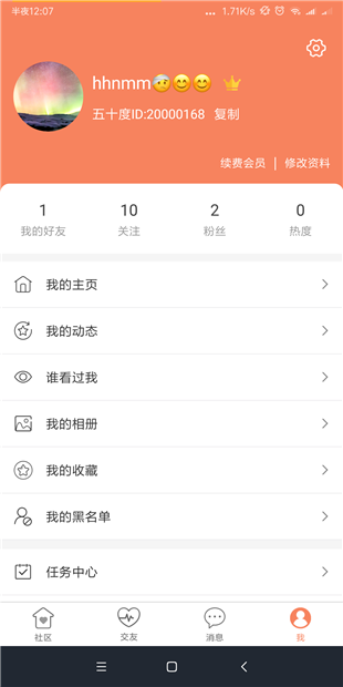 在我的里面用户可以查看自己的基础信息,包括头像,好友,关注,粉丝,热度等,同时用户可以看到关于app的版本信息,app的基础信息设置等功能
