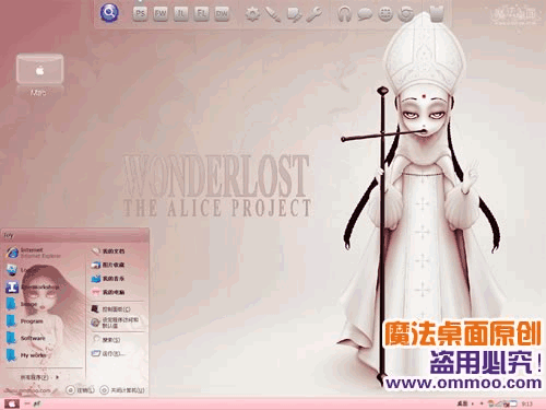 魔法桌面原创xp仿mac桌面主题——鬼娃娃仿苹果。选用另类的《魔境爱丽丝》做壁纸,制作成粉色系的仿mac系列主题,让你体会不一样的阴森恐怖。主题包含三种字体版本,默认是宋体版,您可以在“外观”-“字体大小”处切换至微软雅黑版或是arial字体版。此主题还附带精美的仿mac登陆界面哦